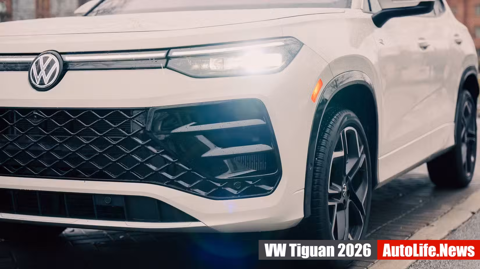 Volkswagen Tiguan SEL R-Line Turbo 2026 года, вид снизу: решетка радиатора, фары и 20-дюймовые диски.